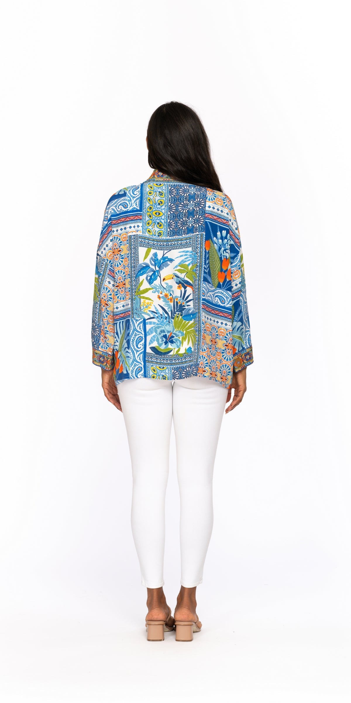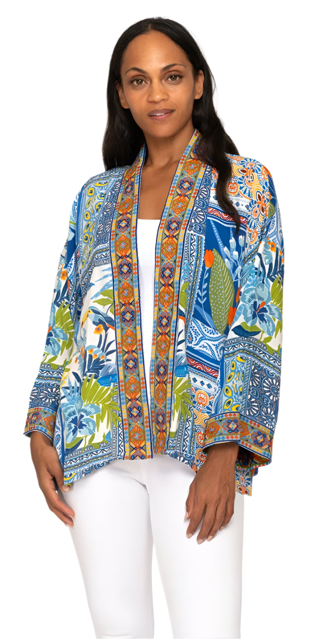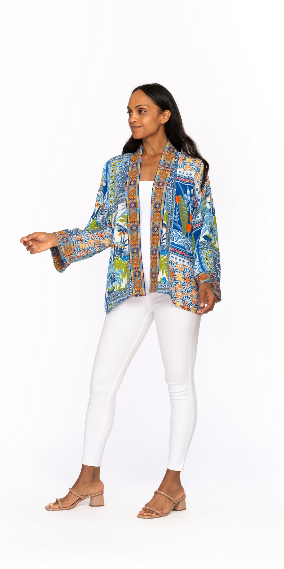 The Elsu Bahamas Kimono is expertly crafted with a long sleeve design and an open front, creating a versatile and stylish piece. The contrast print border adds a touch of unique detail. Made from high-quality materials, this kimono offers both comfort and elegance, making it a must-have for any wardrobe.