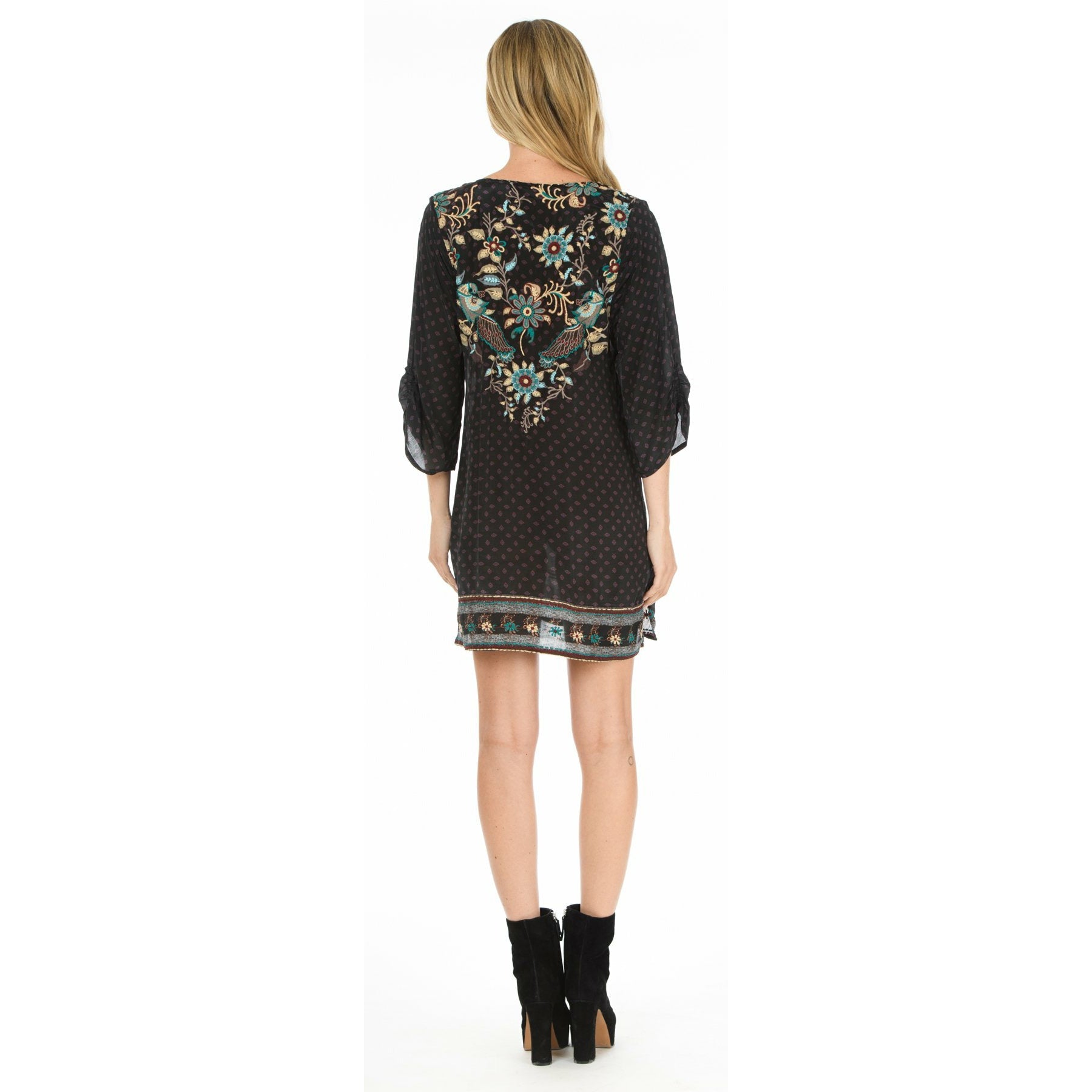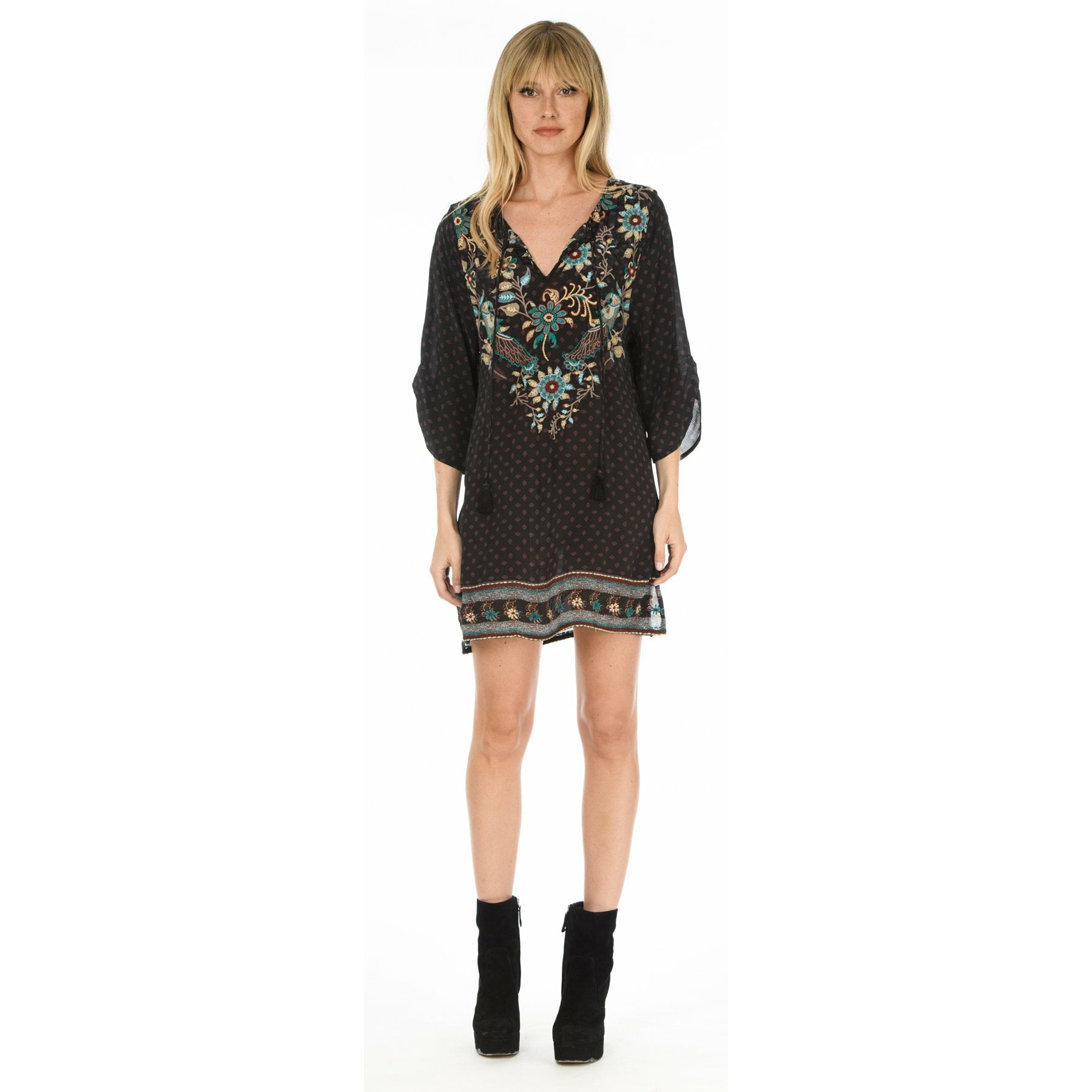 Expertly crafted with stylish embroidery, the Nicoli Peacock Tunic Dress features a v-neck with tassel and 3/4" sleeves. Perfect for any occasion, this dress adds an elegant touch to your wardrobe.
