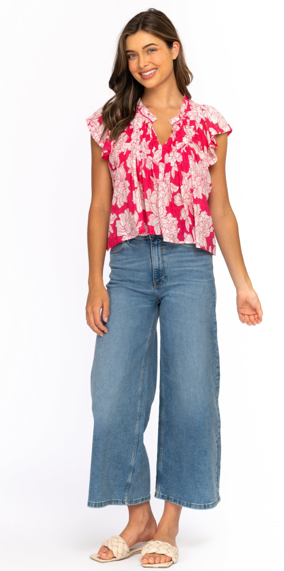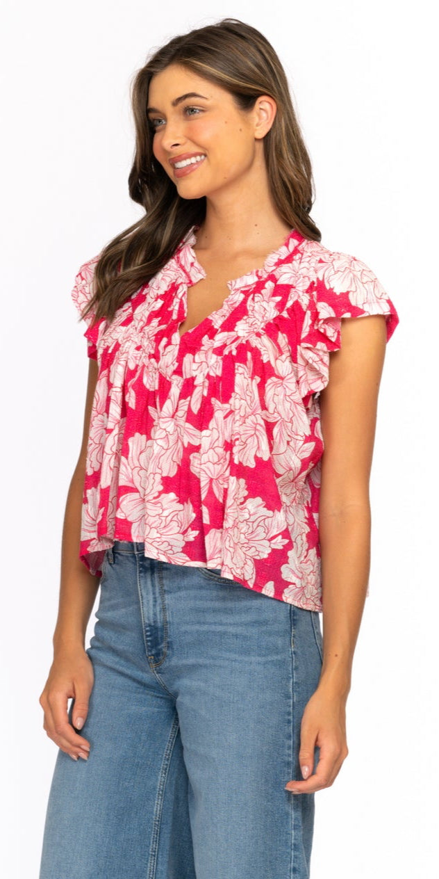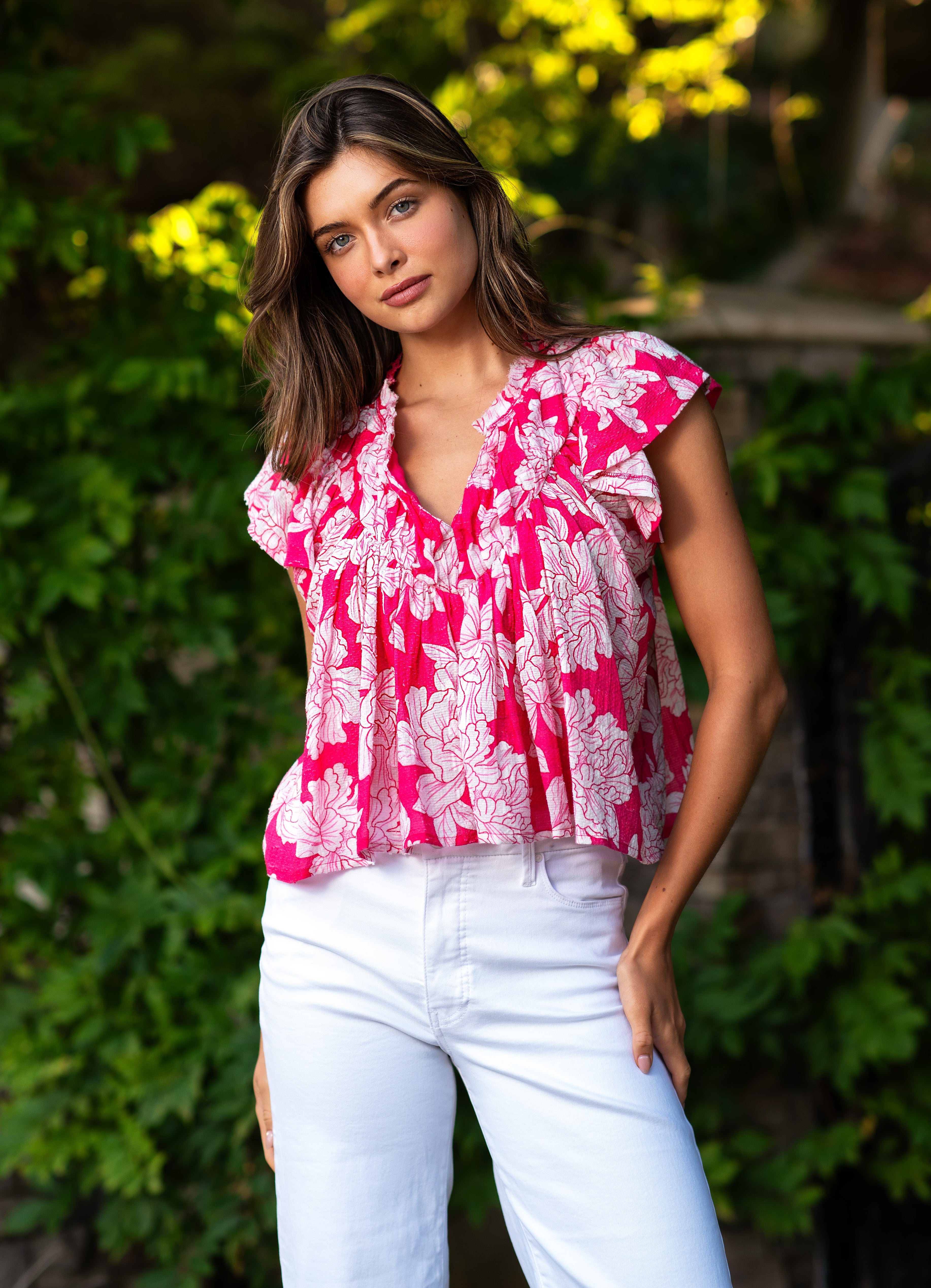 Bright, breezy, and beautifully effortless. This floral flutter-sleeve top features soft gathers, a relaxed fit, and a bold pink-and-white print that instantly uplifts any outfit. Pair it with white denim for a crisp summer look or dress it down with shorts for weekends on the go.