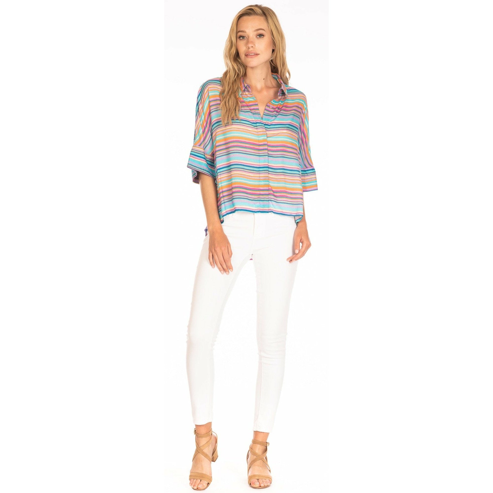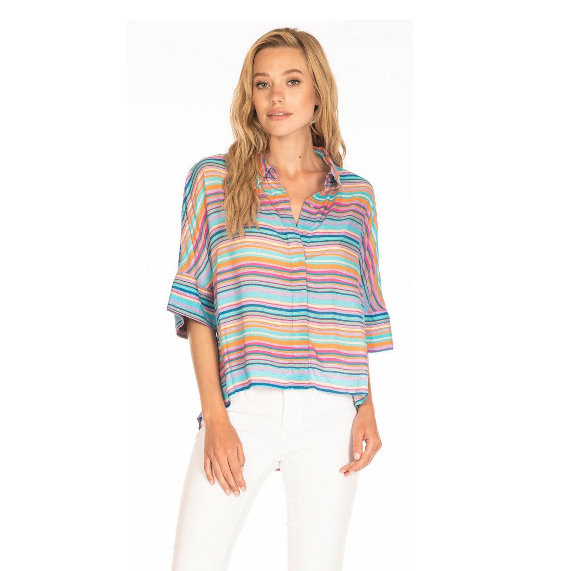 This Elsie Stripes Top features bold, contrasting prints for a feminine and eye-catching look. Its button front and collar add a touch of sophistication, making it the perfect choice for both a night out or a day at the park. Elevate your wardrobe with this versatile and stylish top.