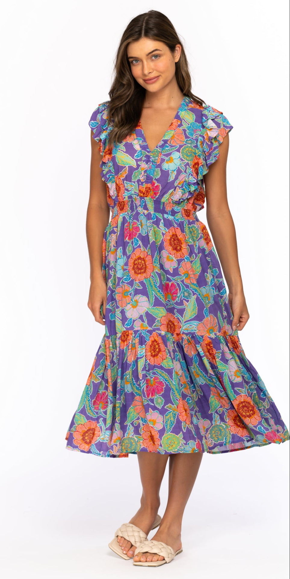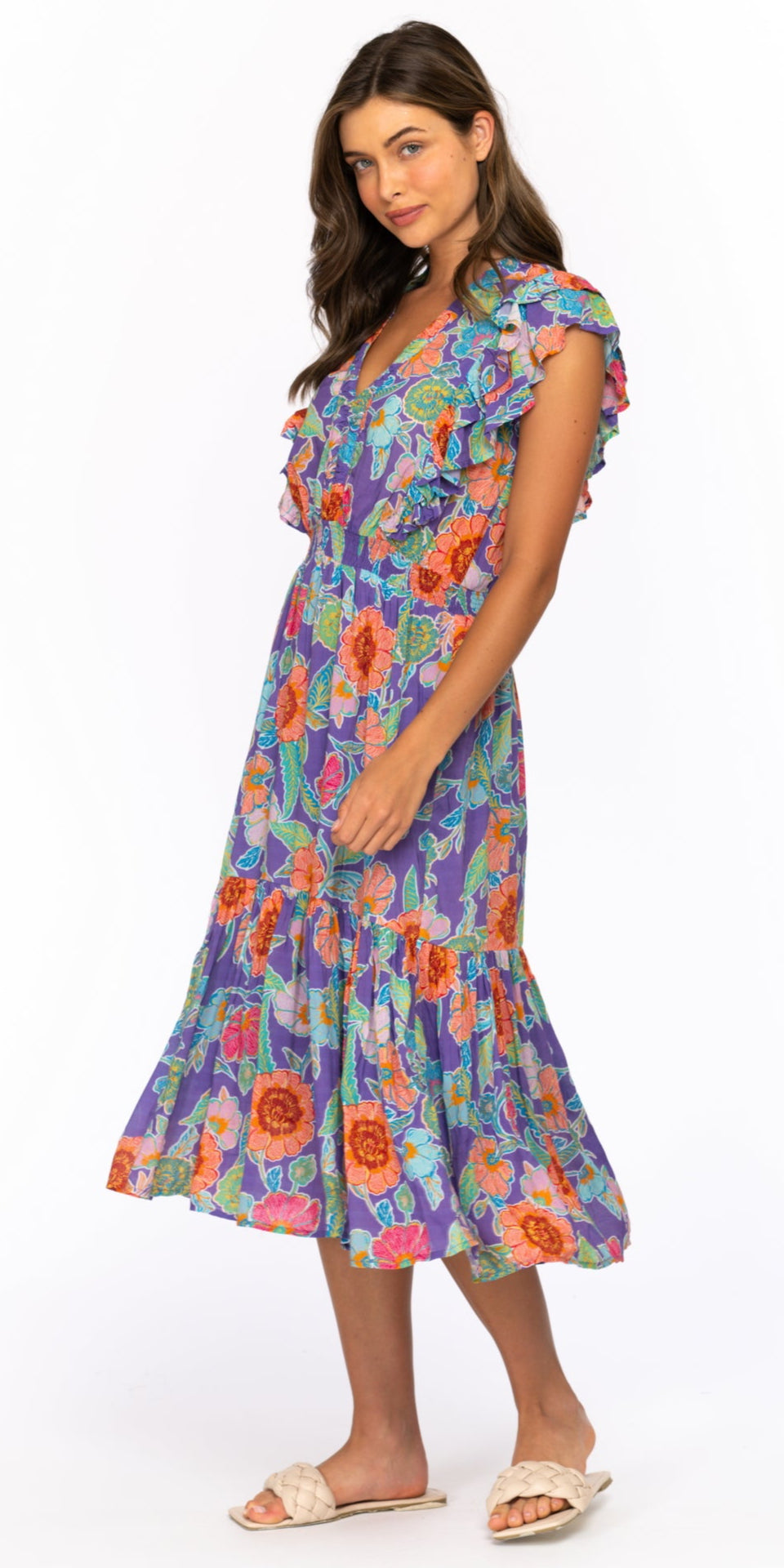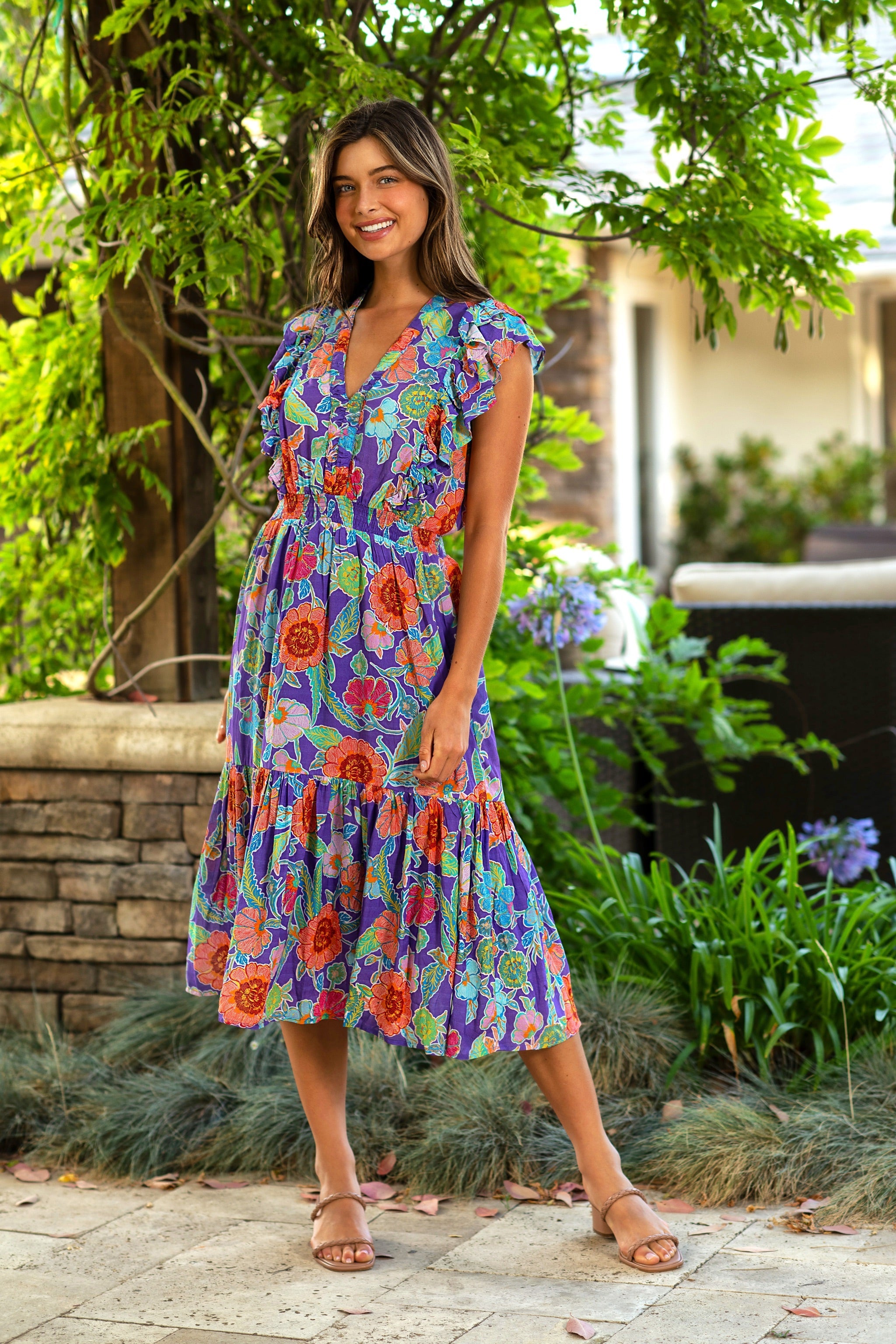 Step into effortless elegance with this vibrant floral midi dress. Featuring a rich purple backdrop adorned with bold orange and pink blooms, this flowy silhouette is perfect for both daytime outings and evening gatherings. Delicate ruffle sleeves and a tiered skirt add feminine charm and movement to this eye-catching piece.